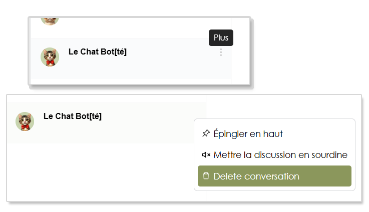 Pour supprimer une conversation avec le ChatBot, Survoler le nom du ChatBot puis cliquer sur les 3 points à la droite du nom.