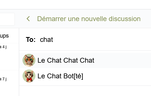 Puis, dans la zone de texte « To: » saisir « chat » pour rechercher tous les utilisateurs dont le nom contient « chat ». Cliquer ensuite sur le Chatbot de votre choix pour démarrer la conversation.